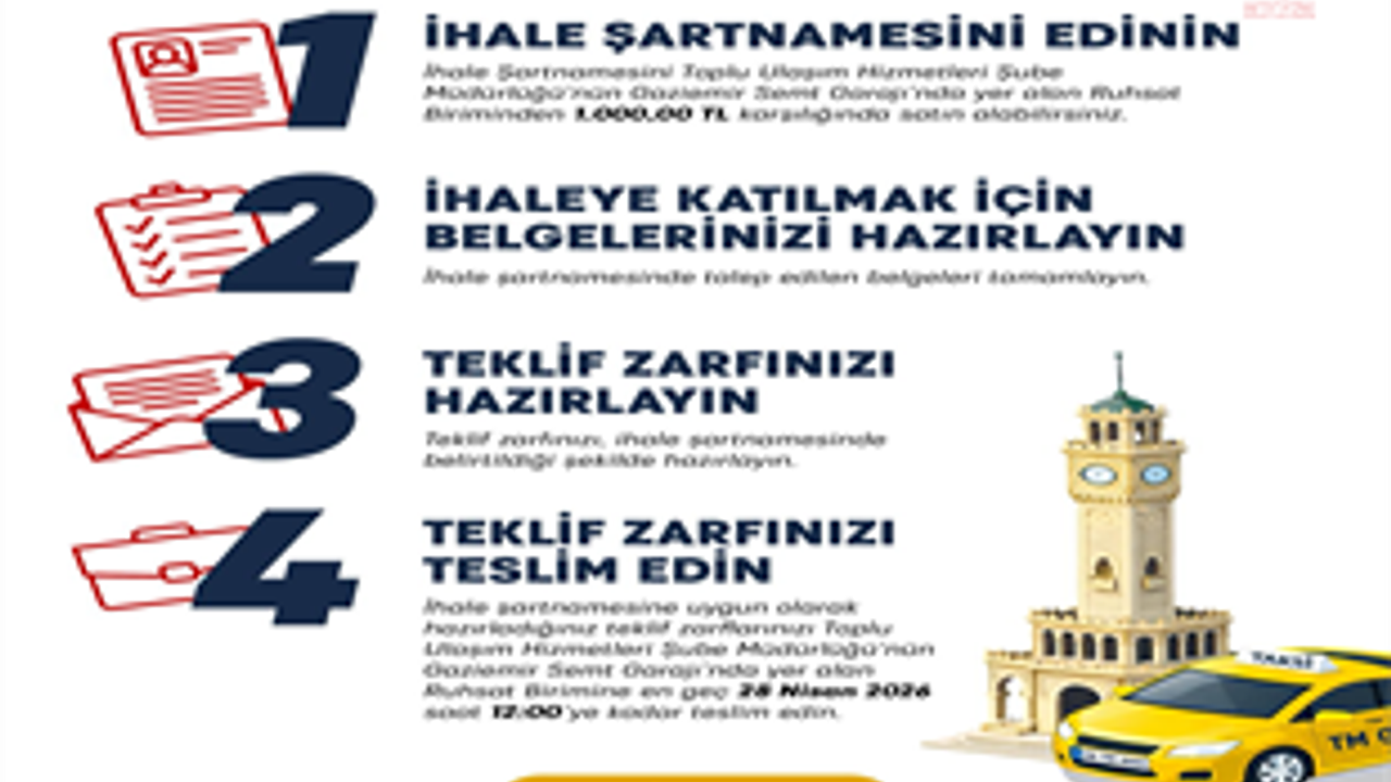 İzmir Büyükşehir Belediyesi'nin; Balçova, Bayraklı, Bornova, Buca, Çiğli, Gaziemir, Güzelbahçe, Karabağlar, Karşıyaka, Konak ve Narlıdere olmak üzere kent merkezindeki 11 ilçede 29 yıl süreyle hizmet verecek 100 taksi plakası için düzenlediği ihale 30 Nisan Perşembe günü saat 14.00'te Meclis Salonu'nda yapılacak. İhaleye katılmak isteyenler, 28 Nisan Salı günü saat 12.00'ye kadar başvurularını Gaziemir Semt Garajı'nda bulunan Toplu Ulaşım Hizmetleri Şube Müdürlüğü Ruhsat Birimi'ne yapabilecek.