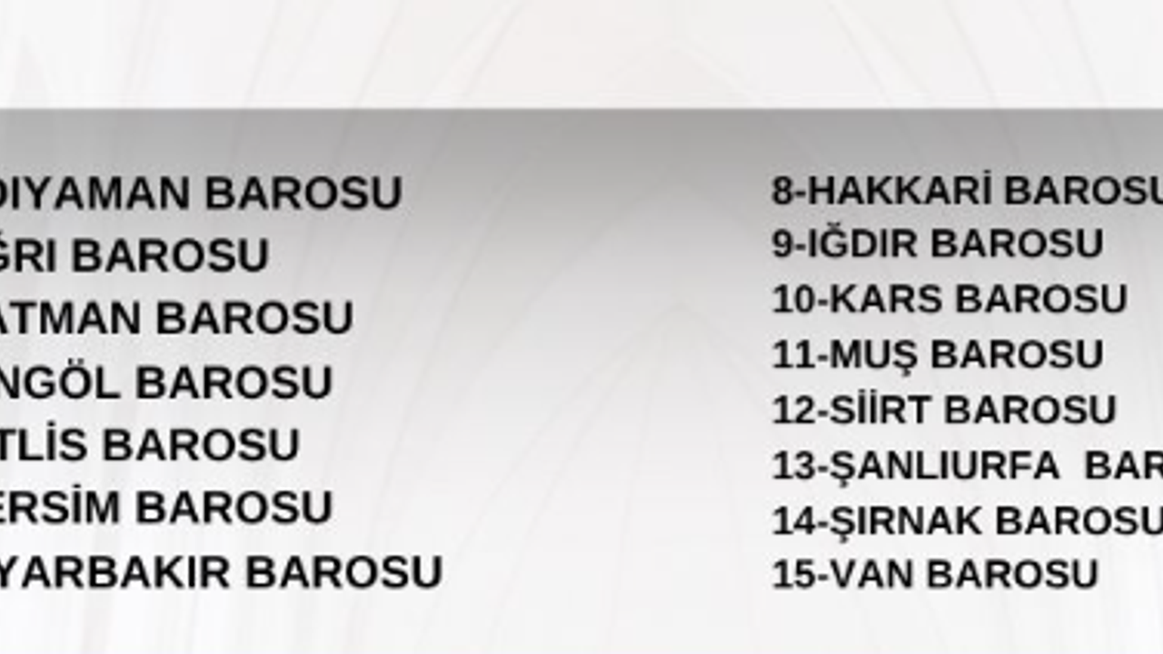 Adıyaman Barosu, Ağrı Barosu, Batman Barosu, Bingöl Barosu, Bitlis Barosu, Dersim Barosu, Diyarbakır Barosu, Hakkari Barosu, Iğdır Barosu, Kars Barosu, Muş Barosu, Siirt Barosu, Şanlıurfa Barosu, Şırnak Barosu, Van Barosu.