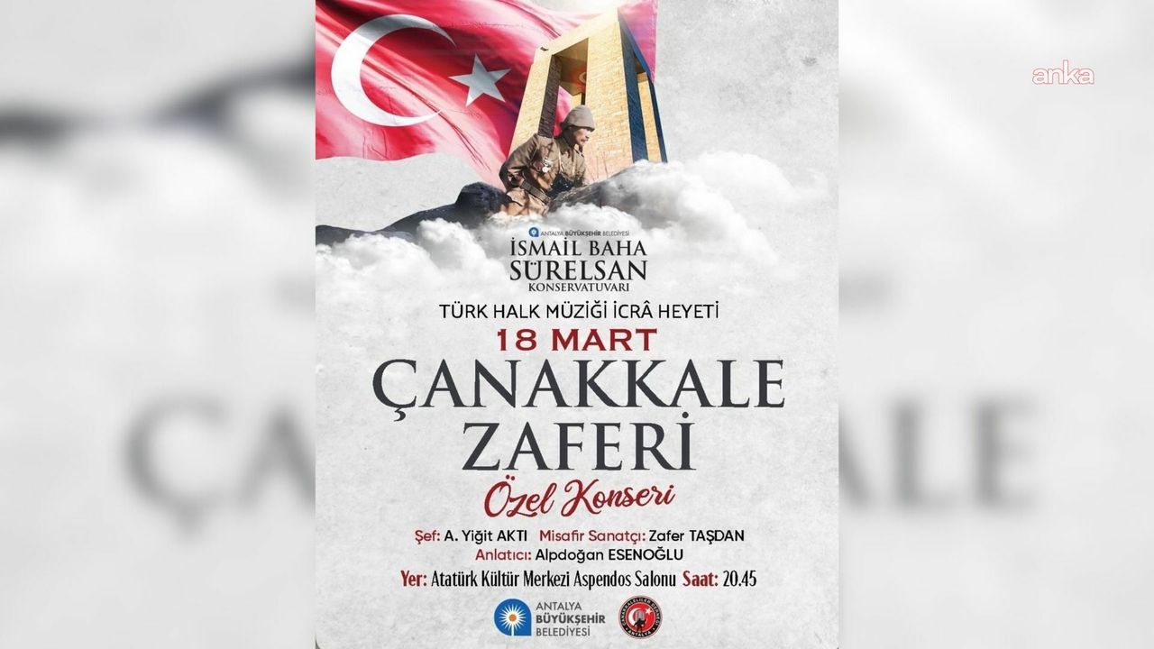 Şef Yiğit Aktı yönetimindeki Antalya Büyükşehir Belediyesi İsmail Baha Sürelsan Konservatuvarı Türk Halk Müziği İcrâ Heyeti tarafından 18 Mart dolayısıyla hazırlanan konserde, Çanakkale Zaferi'nin anlam ve önemine ithafen türküler ve anlatılar seslendirilecek. Alpdoğan Esenoğlu'nun anlatıcılığını yapacağı programda, TRT İstanbul Radyosu sanatçısı Zafer Taşdan konuk sanatçı olarak yer alacak.