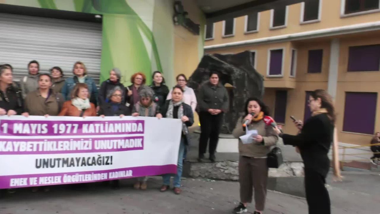 'Bizler İstanbul Emek Meslek Örgütlerinden kadınlar olarak, 1 Mayıs 1977'de bu meydanda yaşamını yitiren kadınları ve o gün kaybettiğimiz tüm sınıf kardeşlerimizin anılarını yaşatmak, mücadele içinde yitirdiğimiz tüm kadınları anmak için Taksim Meydanı'ndayız. Bu meydan 1 Mayıs'ta, 25 Kasım'da ve 8 Mart'larda kadın cinayetlerine isyan eden kadınlara kapatılırken; yine bu meydanda futbol taraftarı erkeklerin saldırgan bir tonda, cinsiyetçi küfürler haykırarak yürümesi ise kabul görüyor.