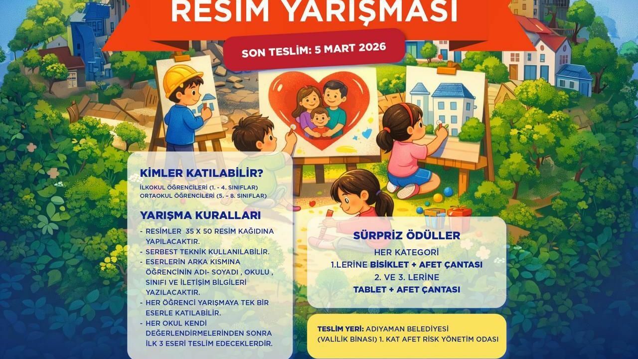 Adıyaman Belediyesi Afet İşleri ve Risk Yönetimi Müdürlüğü tarafından düzenlenecek resim yarışması, ilkokul 1-4. sınıflar ile ortaokul 5-8. sınıf öğrencilerinin katılımına açık olacak. Öğrenciler, deprem bilinci ve güvenli yaşam temalı eserlerini 35x50 santimetre ölçülerindeki resim kağıdına, serbest teknikle hazırlayabilecek. Her öğrenci yarışmaya tek eserle katılabilecek.