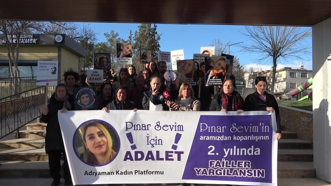 Adıyaman Kadın Platformu üyeleri, Mimar Sinan Kültür Parkı güney kapısında bir araya gelerek 22 Şubat 2024'te öldürülen 28 yaşındaki sağlık çalışanı Pınar Sevim için adalet talebini yineledi. Pınar Sevim'in babası ve anneannesinin de hazır bulunduğu basın açıklaması sırasında 'Koruma, aklama, failleri yargıla' ve 'Pınar için adalet, herkes için adalet' sloganları atıldı.