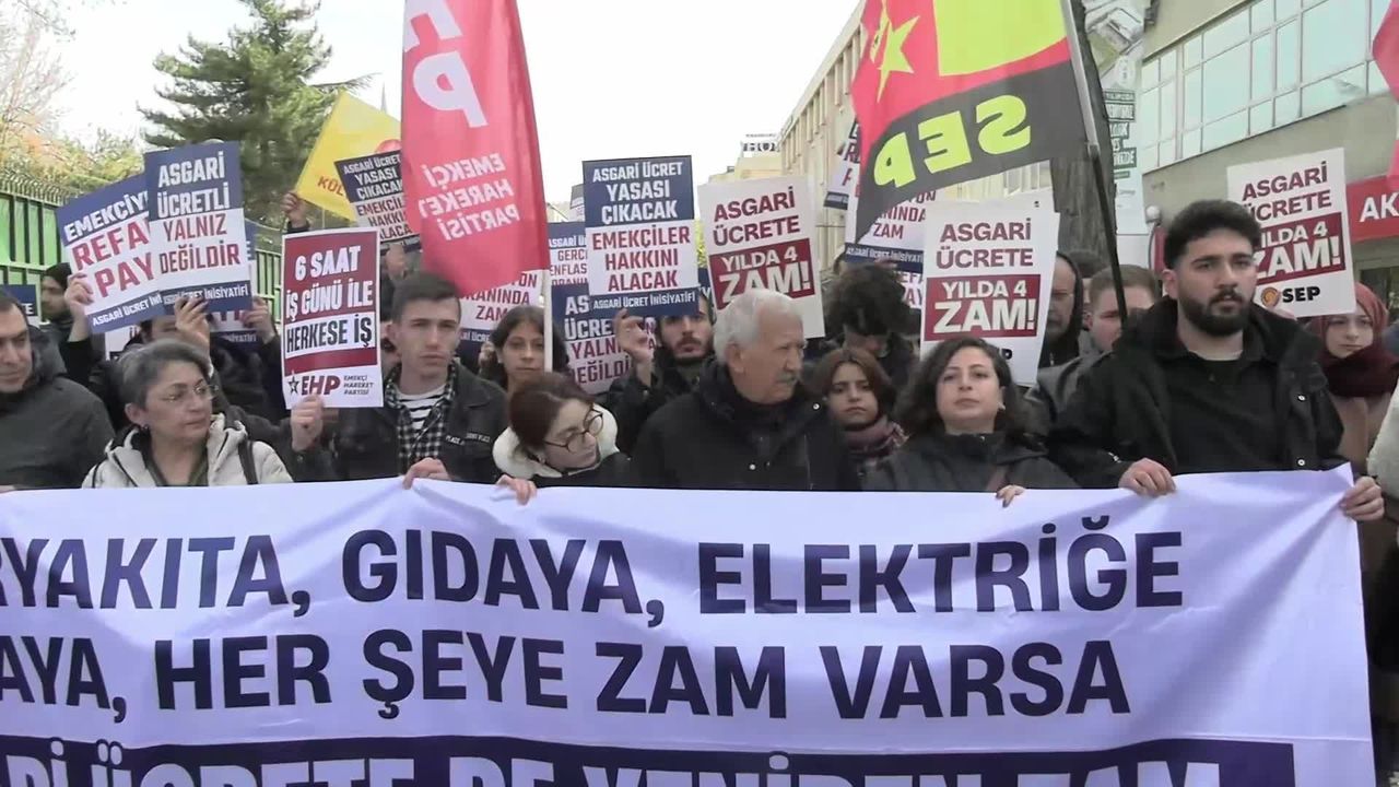 'Akaryakıta, gıdaya, elektriğe, kiraya her şeye zam varsa asgari ücrete de yeniden zam' yazılı pankartın ardında toplanan eylemciler, 'Asgari ücrete yılda 4 zam', 'Emekçiye refah payı', '6 saat iş günü ile herkese iş' ve 'Asgari ücrete yeniden zam' yazılı dövizler taşıyarak, 'AKP'den hesabı emekçiler soracak' ve 'Asgari ücretli yalnız değildir' sloganları attı.