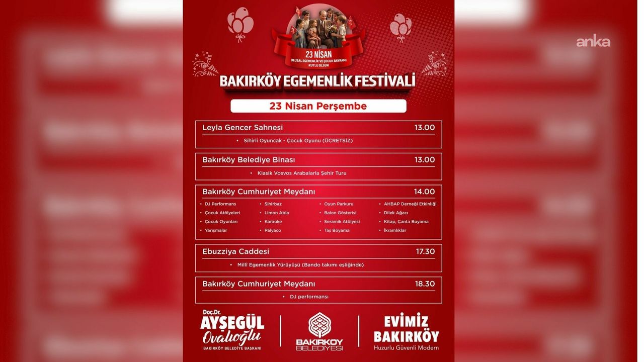 (İSTANBUL) - Bakırköy Belediyesi, 23 Nisan Ulusal Egemenlik ve Çocuk Bayramı'nı, 21-23 Nisan 2026 tarihleri arasında düzenleyeceği 'Egemenlik Festivali' ile kutlamaya hazırlanıyor. İlçenin farklı noktalarında gerçekleştirilecek festivalde, çocuklar için atölyelerden gösterilere, uçurtma şenliğinden yürüyüşe kadar birçok etkinlik yer alacak.