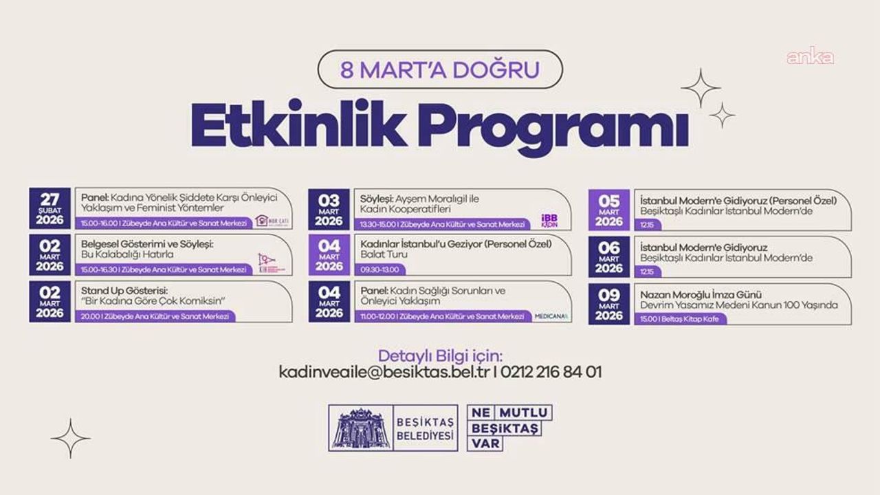 (İSTANBUL) - Beşiktaş Belediyesi, 8 Mart Dünya Kadınlar Günü dolayısıyla bir dizi etkinlik düzenliyor. '8 Mart'a Doğru' başlığıyla hazırlanan etkinlik programında paneller, belgesel gösterimleri, söyleşiler, stand up gösterileri, geziler ve imza günleri yer alıyor. Etkinlikler, toplumsal cinsiyet eşitsizliğine karşı farkındalık ve kadın dayanışmasına dikkati çekmeyi hedefliyor.