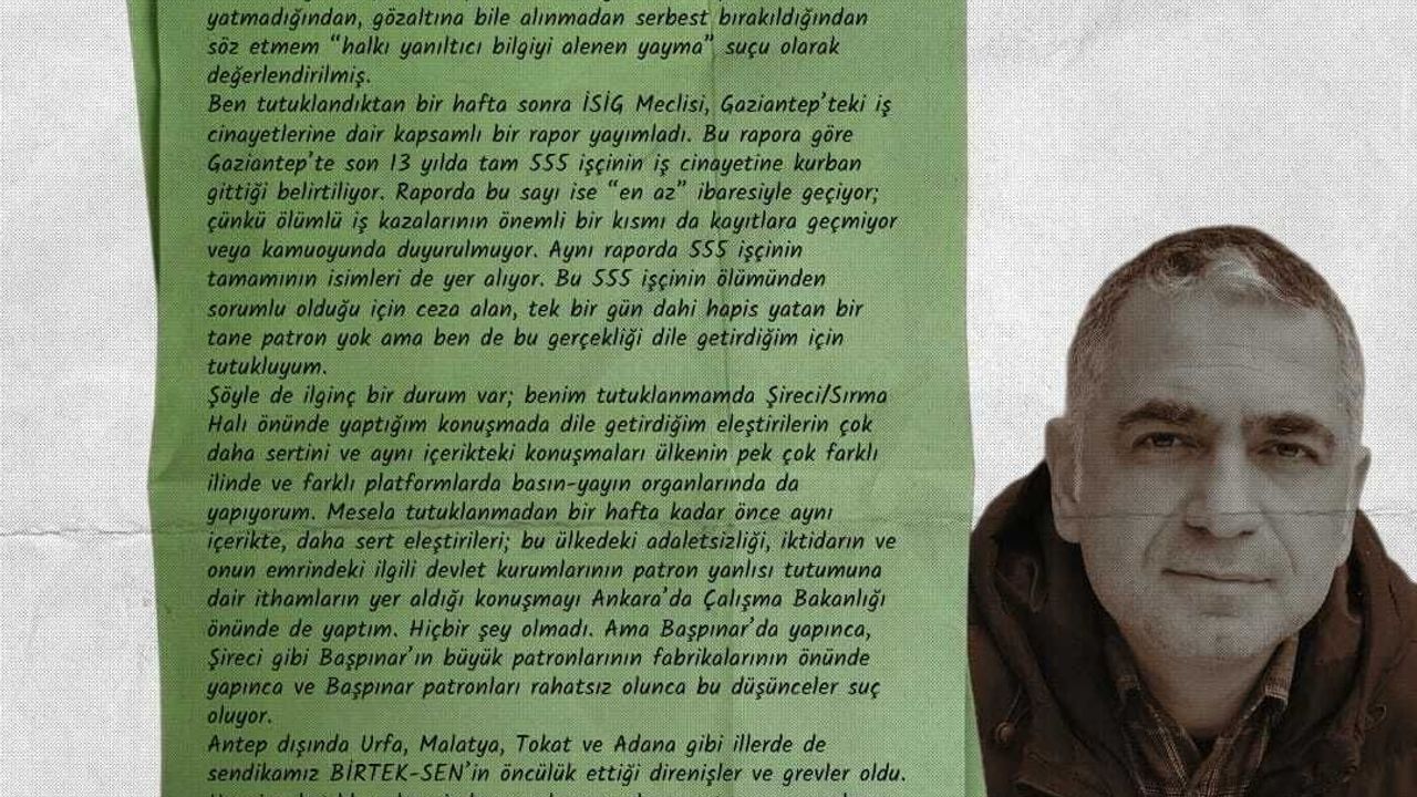 (GAZİANTEP) - BİRTEK-SEN Genel Başkanı Mehmet Türkmen, Gaziantep E Tipi Cezaevi'nden gönderdiği açık mektupta 41 gündür tutuklu olduğunu anımsatarak, 'Patronların, işçilerin haklarına ve hayatına çöktüğü bu düzen sürsün diye tutukluyum' dedi.