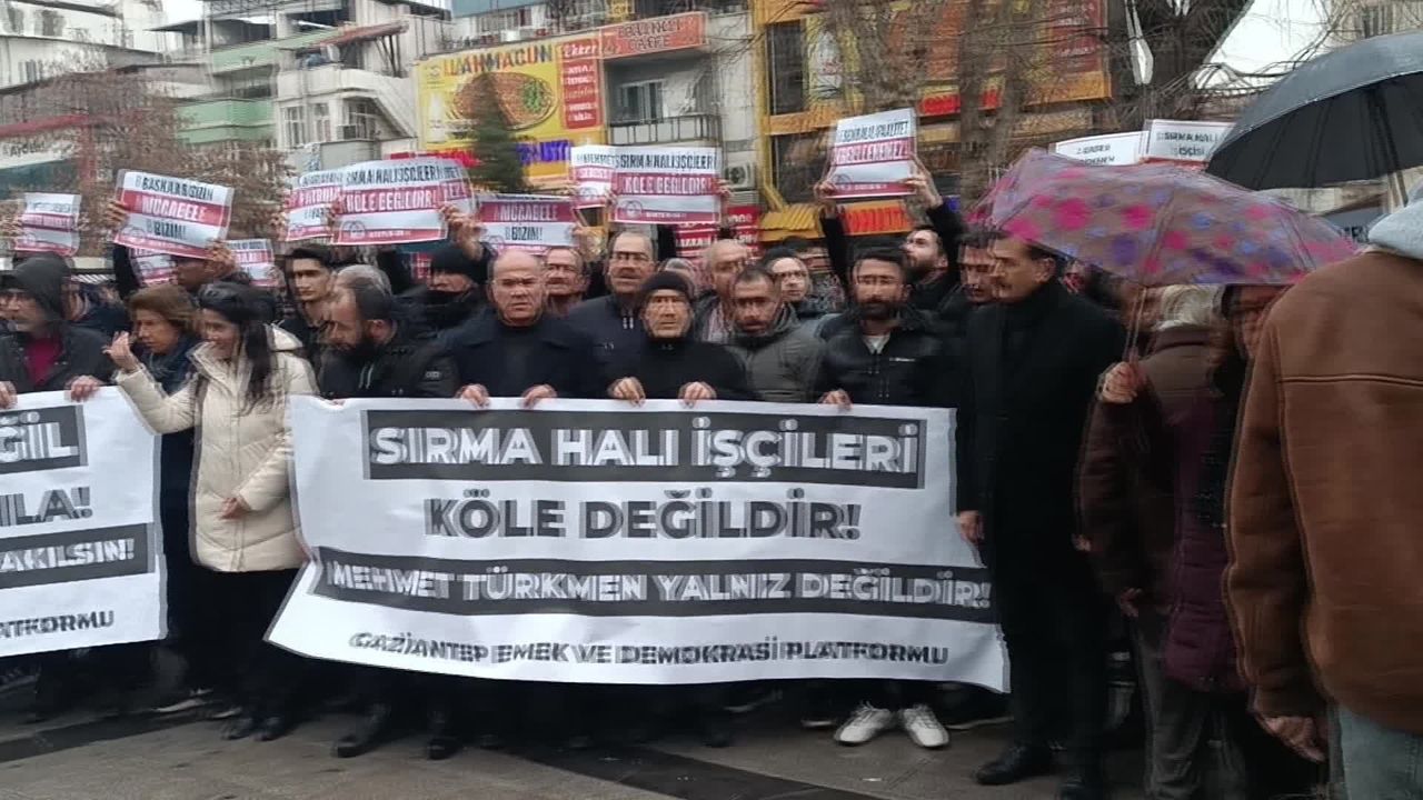 (GAZİANTEP) - BİRTEK-SEN Genel Başkanı Mehmet Türkmen'in Sırma Halı işçilerinin eyleminde yaptığı konuşma gerekçesiyle tutuklanması nedeniyle Birleşik Tekstil Dokuma ve Deri İşçileri Sendikası (BİRTEK-SEN) Genel Başkanı Mehmet Türkmen için Gaziantep'te protesto eylemi düzenlendi. Gaziantep Emek ve Demokrasi Platformu, 'Asıl sorulması gereken, işçilerin haklarını gasp eden patronlara neden işlem yapılmadığıdır' dedi.