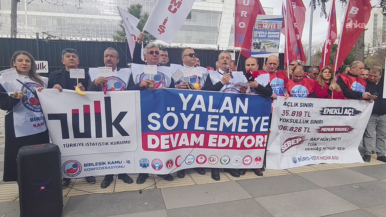 Büro-İş Sendikası yönetimi ve üyeleri, TÜİK'in mart ayına ilişkin enflasyon verilerini açıklamasının ardından TÜİK önünde açıklama yaptı. Açıklamada, ekonomik krizin derinleştiği belirtilerek TÜİK'in verilerine tepki gösterildi. Açıklamada, 'Yanlış ekonomi politikalarında ısrar ve kötü yönetim sonucu içine düştüğümüz ekonomik kriz aydan aya derinleşirken, TÜİK'in gerçekleri makyajlamaya yönelik beyhude çabası sürüyor' denildi.