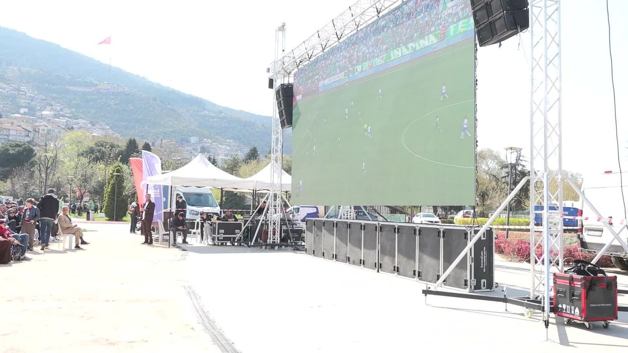 (BURSA) - Bursaspor'un TFF 2. Lig'de Ankara Demirspor ile Eskişehir'de oynadığı karşılaşma, Büyükşehir Belediyesi tarafından Kültürpark Atatürk Stadyumu girişi Millet Bahçesi'nde kurulan dev ekranda yüzlerce taraftarın katılımıyla hep birlikte izlendi.