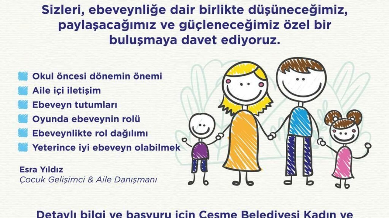 (İZMİR) - Çeşme Belediyesi, ailelerin ebeveynlik sürecinde güçlenmesini desteklemek amacıyla Ebeveyn Atölyesi düzenleyecek. Kadın ve Aile Hizmetleri Müdürlüğü koordinasyonundaki atölye, 27 Şubat 2026 Cuma günü saat 11.00-12.30 arasında Yuvamız Çeşme Reisdere Çocuk Etkinlik Merkezi'nde yapılacak.