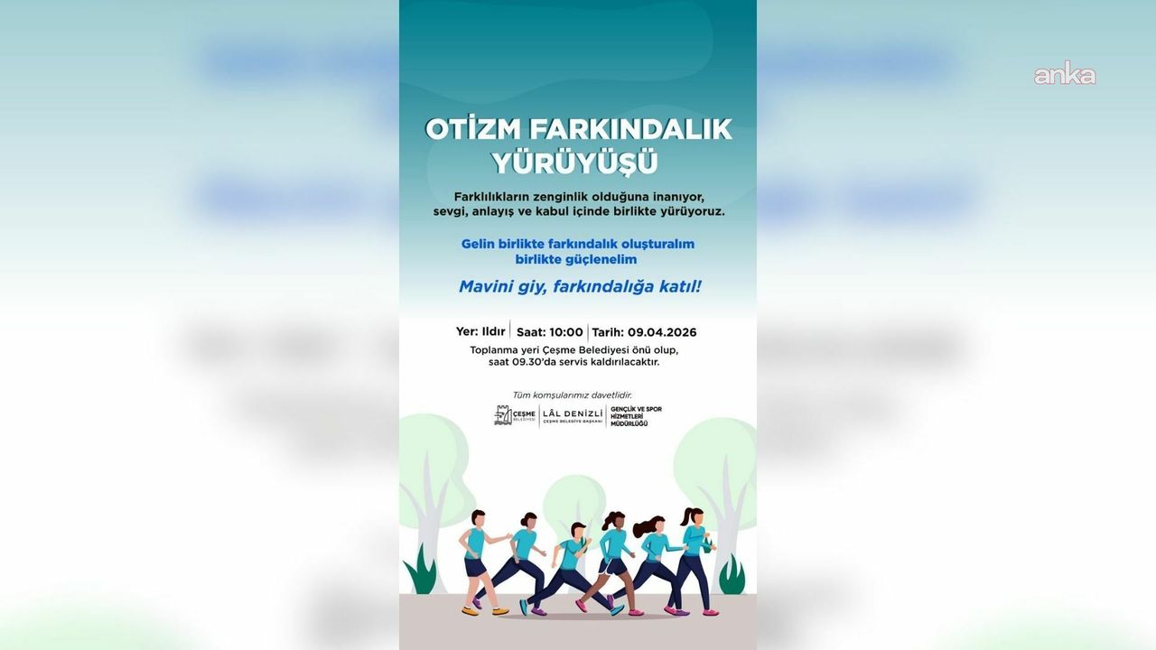 (İZMİR) - Çeşme Belediyesi, otizm konusunda toplumsal farkındalığı artırmak amacıyla anlamlı bir etkinliğe imza atıyor. 9 Nisan 2026 tarihinde Ildır'da gerçekleştirilecek 'Otizm Farkındalık Yürüyüşü' ile sevgi, anlayış ve kabulün önemine dikkat çekilecek.