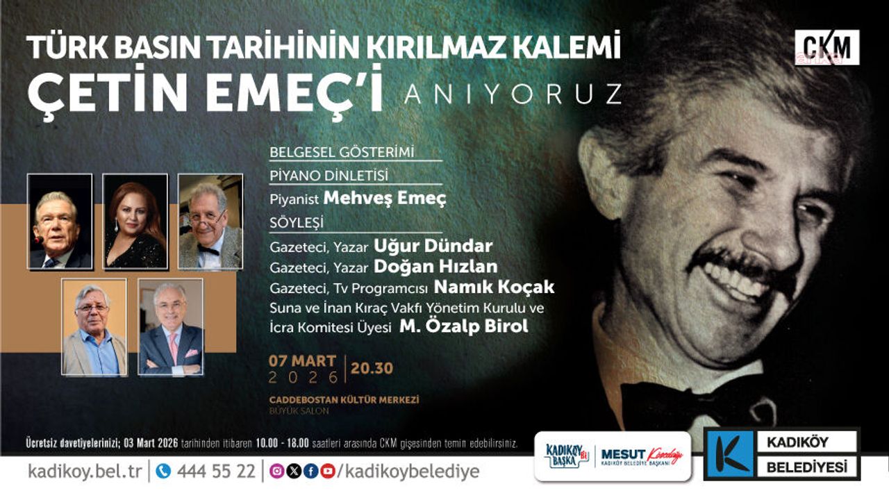(İSTANBUL) - Gazeteci-yazar Çetin Emeç, ölümünün 36'ncı yılında Kadıköy Belediyesi'nin düzenleyeceği programla anılacak. Etkinlik, 7 Mart Cumartesi günü saat 20.30'da Kadıköy Belediyesi Caddebostan Kültür Merkezi'nde gerçekleştirilecek.