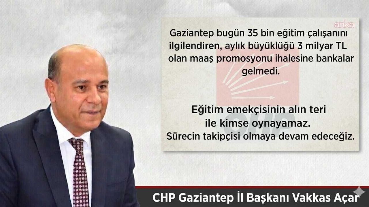 (GAZİANTEP) - CHP Gaziantep İl Başkanı Vakkas Açar, kentte 33 binin üzerinde eğitim çalışanını kapsayan maaş promosyonu ihalesinde teklifin düşük olduğunu belirterek, 'Türkiye'nin finans kaymağını yiyen bankaların bu ihaleyi ciddiye almaması kabul edilemez. Teklif edilen rakamlar eğitim camiasını rencide edecek boyuta gelmiştir. Bu süreçte eğitim emekçilerimizin hakkının korunması için konunun ısrarlı takipçisi olacağız' dedi.