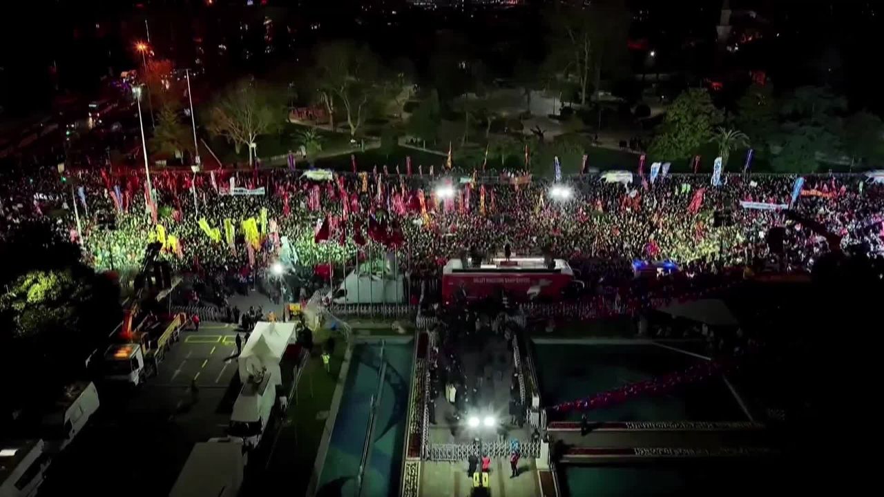 CHP'nin Cumhurbaşkanı adayı ve İstanbul Büyükşehir Belediye (İBB) Başkanı Ekrem İmamoğlu'nun serbest bırakılması ve erken seçim talebiyle başlattığı 'Millet İradesine Sahip Çıkıyor' mitinglerinin 99'uncusu İmamoğlu'nun tutukluluğunun birinci yılı sebebiyle İBB binasının bulunduğu Saraçhane'de yapıldı.