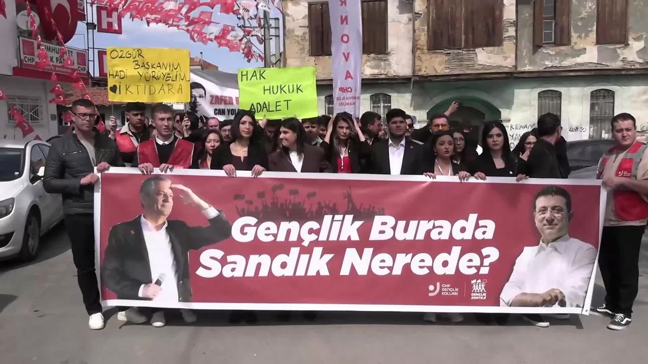 'Gençlik burada, umut burada', 'Her şey çok güzel olacak', 'Cumhurbaşkanı İmamoğlu' sloganlarıyla yürüyen CHP Gençlik Kolları üyeleri, ellerinde 'Hak, hukuk, adalet' ve 'Ben cumhuriyet kadınıyım, sen seversin sevmezsin' yazılı dövizler ile 'Gençlik burada, sandık nerede' yazılı pankart taşıdılar.
