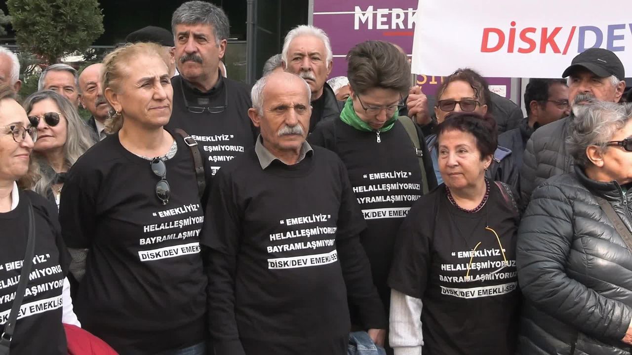 DİSK'e bağlı DEV Emekli Sen üyeleri, bayram ikramiyesinin artırılmaması nedeniyle basın açıklaması yaptı. Açıklamaya katılanlar 'Emekliyiz, hellaleşmiyoruz, bayramlaşmıyoruz' yazılı tişörtler giydi.