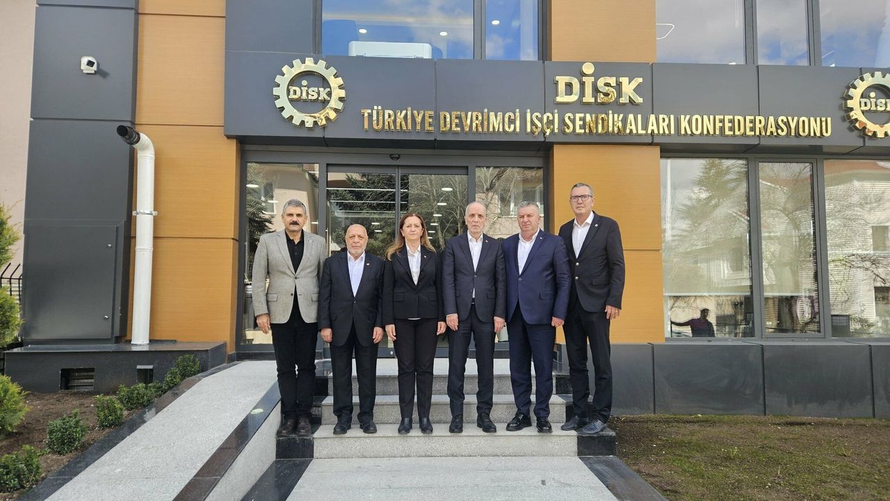'TÜRK-İŞ Genel Başkanı Ergün Atalay ve HAK-İŞ Genel Başkanı Mahmut Arslan, Ankara'da DİSK Genel Merkezi'nin yeni binasına hayırlı olsun ziyaretinde bulundu. Genel Başkanımız Arzu Çerkezoğlu, Genel Sekreterimiz Tayfun Görgün, Genel Başkan Yardımcımız Remzi Çalışkan ve Yönetim Kurulu Üyemiz Şükret Sevgener'in olduğu görüşmede emeğin güncel sorunları üzerine görüş alışverişinde bulunuldu.'