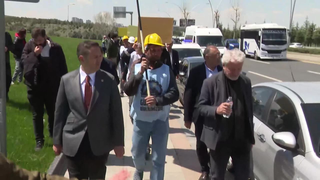(ANKARA)- Doruk Madencilik işçileri, alacaklarının ödenmesi talebiyle başlattığı Ankara yürüyüşünün 9. gününde Enerji ve Tabii Kaynaklar Bakanlığı'na yürüdü. Yürüyüş esnasında konuşan bir işçi, 'Eğer biz sokaklara dökülmüşsek, biz haklarımızı istiyorsak bıçak kemiğe dayanmayı geçmiştir. Canımız yanmasa biz buralara gelmeyiz. Yetkililerden destek bekliyoruz' dedi.