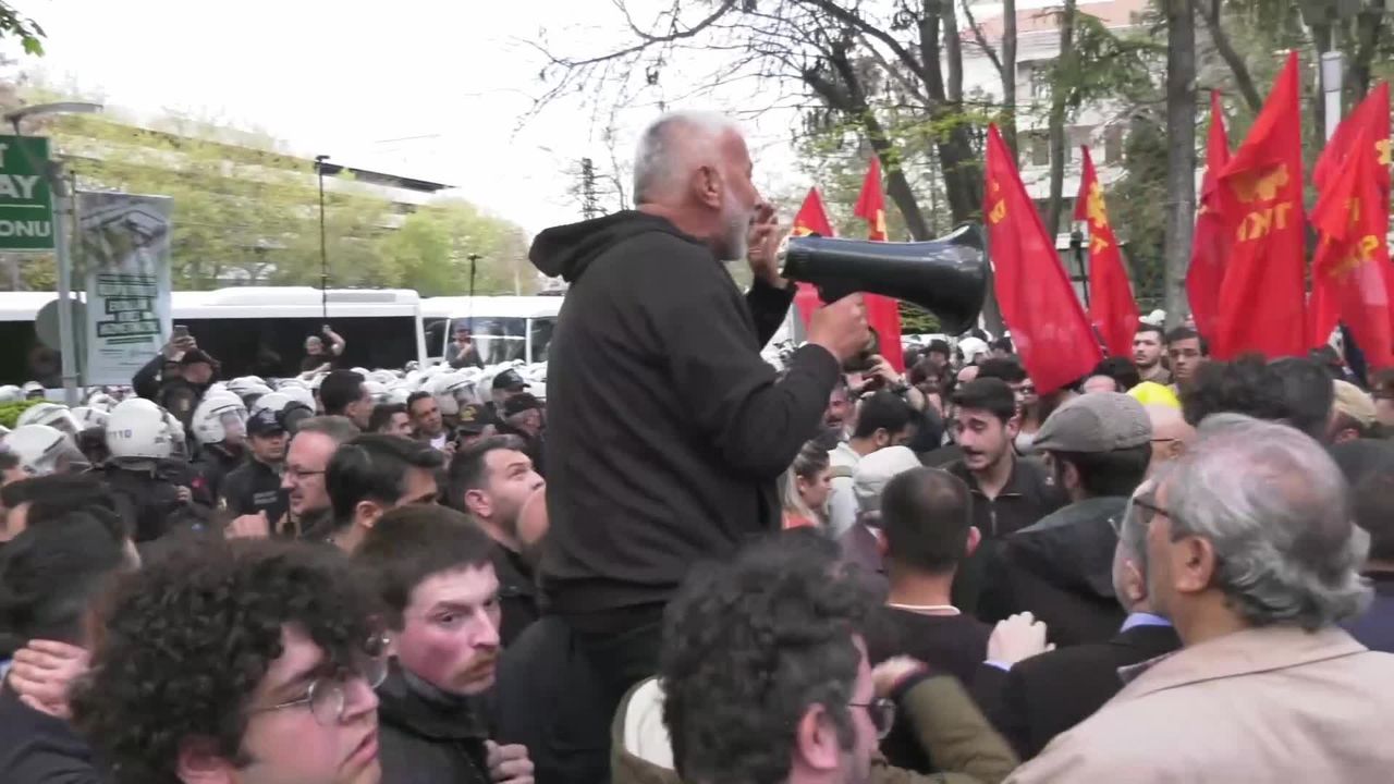 (ANKARA) - Doruk Madencilik işçilerinin açlık grevinin 8'inci gününde Enerji ve Tabii Kaynaklar Bakanlığı'na yürüyüşüne polis müdahale etti. Bağımsız Maden İş Sendikası Örgütlenme Uzmanı Başaran Aksu, 'Derdimiz kimseyle kavga etmek değil. Bakanlar kavga etmek istiyorsa burdayız gelsinler. Polisi, madencinin karşısına çıkarmak çaresizliktir, meseleyi saptırmaktır, madencinin hakkını gölgelemektir, burada başka olaylar oluyor demektir. Meselemiz yeterince siyasi' dedi. Bağımsız Maden-İş Genel Başkanı Gökay Çakır ve Başaran Aksu gözaltına alındı.