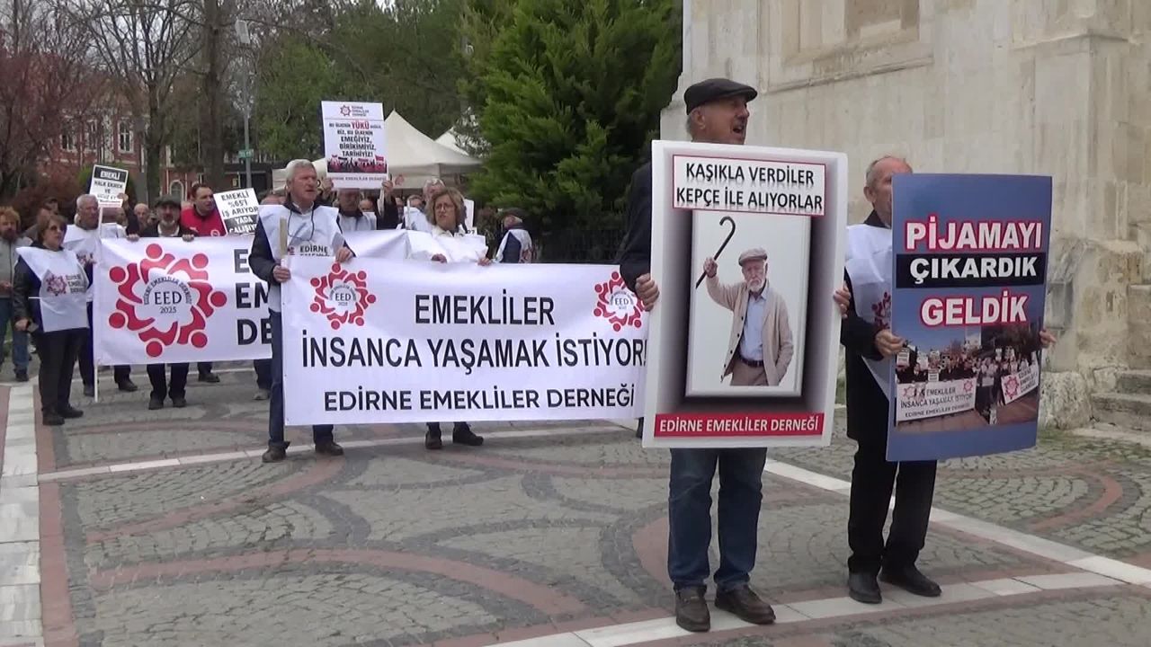 Edirne'de Eski Cami önünde toplanan emekliler, ekonomik sıkıntılara karşı yürüdü. Eski Cami'den, Saraçlar Caddesi'ne kadar yürüyen emekliler, 'insanca yaşamak istiyoruz' pankartı açtı.