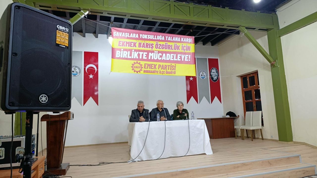 EMEP Burhaniye İlçe Başkanlığı tarafından 'Savaşa, yoksulluğa ve çevre katliamlarına birlikte dur demek için' başlıklı toplantı düzenlendi.