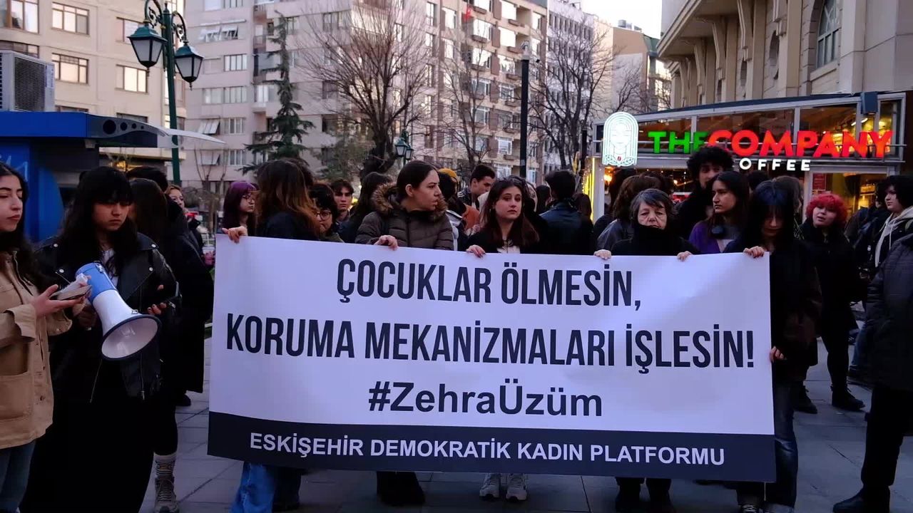 Eskişehir Demokratik Kadın Platformu'nun çağrısıyla İsmet İnönü Caddesi'nde toplanan kadınlar, Eskişehir'de babası tarafından öldürülen 13 yaşındaki Zehra Üzüm için basın açıklaması yaptı. Açıklamaya Zehra Üzüm'ün arkadaşları da katıldı.