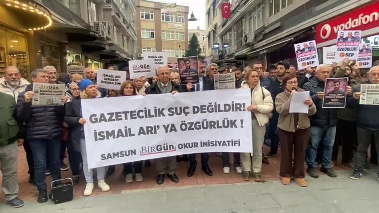 (SAMSUN) - Samsun BirGün Okur İnisiyatifi üyeleri, sivil toplum kuruluşları, gazeteciler ve vatandaşlar, BirGün gazetesi muhabiri İsmail Arı'nın tutuklanmasını protesto etti. Basın açıklamasını okuyan Şafak Yeşiltepe, 'Bu hukuksuz tutukluluğa derhal son verin. Dostumuz İsmail Arı'yı ve tutuklu tüm gazetecileri serbest bırakın' dedi.