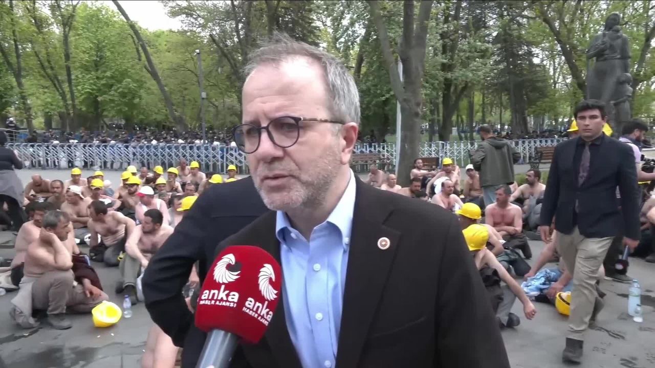 Burada polisin müdahalesiyle karşılaştılar. Elbette burada bir emir kulu, mülki amirler, işçilerin yürümesine izin vermedi, çok sert bir müdahaleyle karşılaşıldı ve sendika başkanı gözaltına aldı. Türkiye bütün dünyaya buradan rezil oluyor. Burada aylardır maaşlarını alamayan, günlerdir aç bir şekilde emek mücadelesi veren bu değerli madencilerin hikayesi, tüm dünyaya yayılıyor ve Türkiye devletiyle kamu otoritesiyle bir emek hırsızı noktasına bürünmüş durumda. Buradan el birliğiyle Türkiye'yi çıkarmak zorundayız. Umarım yetkililer de sağduyulu hareket ederler ve bu madencilerin haklı mücadeleleri menzile erer. Haklı mücadeleleri menzile erdiğinde ben inanıyorum ki, Türkiye'deki emek hareketi de yeni bir aşamaya gelecektir. Tüm madenciler, emekçiler, her yerde haklarını alan, alabilen örgütlü mücadeleyi hep birlikte yükseltmiş olurlar. Ben buranın bir çoban ateşi olduğuna inanıyorum. Burada tüm alkışı, tüm desteği hak eden bu madenciler ve bu madencilerin evlerinde babalarının dönmesini bekleyen eşler, çocuklar. İşçi temsilcileri Bakan yardımcısıyla görüşecekler. Umarım bakan yardımcısı ile yapılan görüşmeden bir sonuç alınır, ki buradan alın terlerini almış olarak kentlerine, kölerine dönmüş olurlar. Biz de onlara her türlü desteği vermeye çalışacağız.'