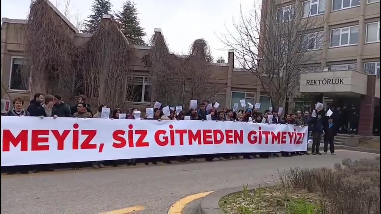 Kampüs içinden Rektörlük binası önüne yürüyen öğrenciler, 'Soruşturmalarla bitmeyiz, siz gitmeden gitmeyiz' yazılı pankart açtı.