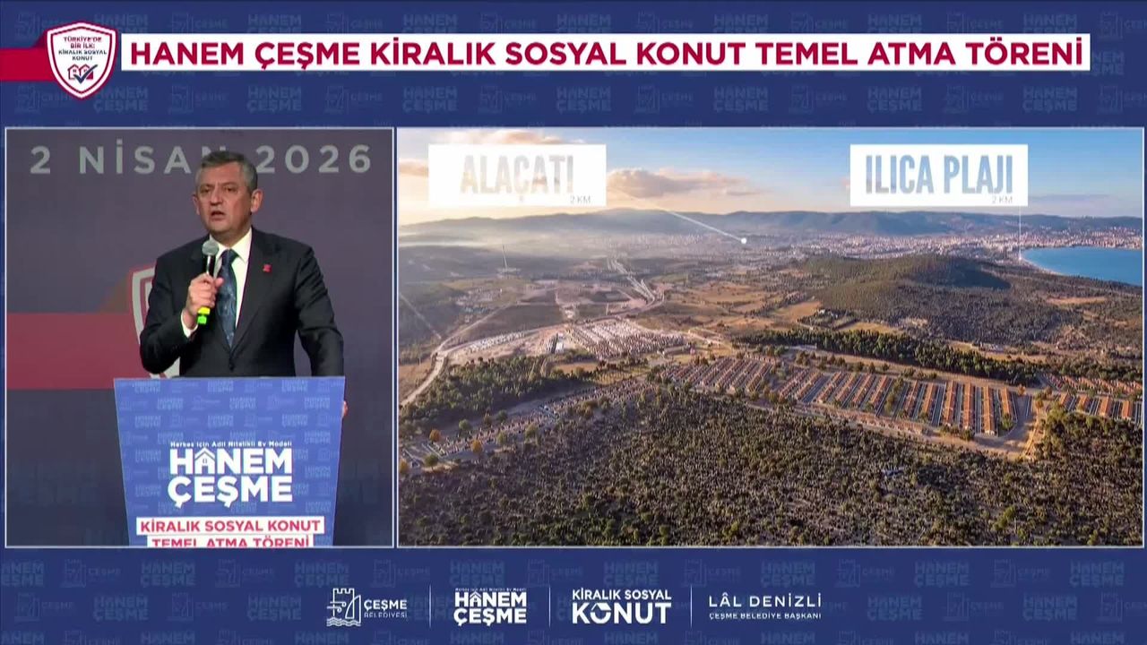 CHP Genel Başkanı Özgür Özel, İzmir'in Çeşme ilçesinde Çeşme Belediyesi tarafından gerçekleştirilen Hanem Çeşme Kiralık Sosyal Konut Projesi'nin temel atma törenine katıldı. törende konuşma yapan Özel, 'Biz bugün burada bir temel atma gerçekleştiriyoruz. Projenin adı: Hanem Çeşme Projesi. Hanem Çeşme, 'Herkes için adil nitelikte ev modeli' kelimelerinin baş harflerinden oluşuyor. Projenin, bir sözlü önerge arz edeceğim müsaadenizle Sayın Genel Başkanım. Projenin bundan sonraki adının, 'Herkese adil nitelikli ev modeli' olmasını alkışlarınızla onayınıza sunuyorum' dedi.