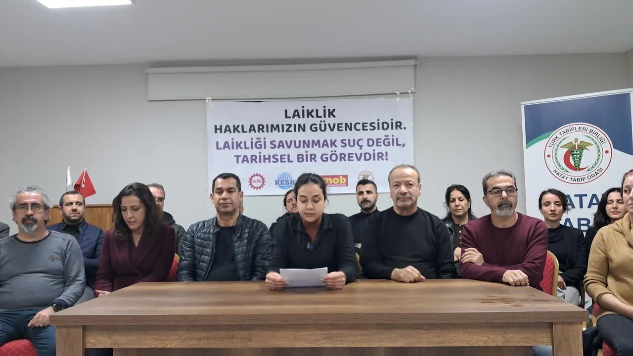 DİSK Hatay Genel-İş Şubesi, KESK Hatay Şubeler Platformu, TMMOB Hatay İl Koordinasyon Kurulu ve Hatay Tabip Odası'ndan 'laikliğe karşı saldırılara ve laikliğin suç olarak gösterilmesi'ne karşı basın açıklaması düzenlendi.