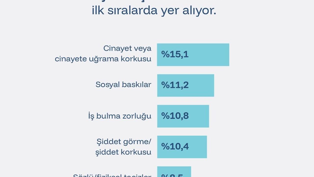 'Cinayet veya cinayete uğrama korkusu yüzde 15,1, sosyal baskılar yüzde 11,2, iş bulma zorluğu yüzde 10,8, şiddet görme/şiddet korkusu yüzde 10,4, sözlü/fiziksel tacizler yüzde 8,5.'