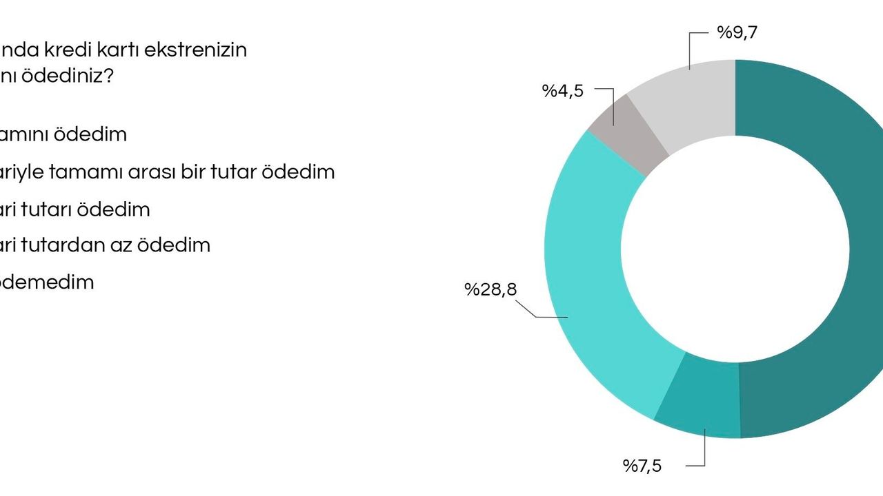 Şubat ayında kredi kartı borcunun tamamını ödediğini belirtenlerin oranı yüzde 49,6 olarak kayıtlara geçti. Asgari tutardan daha az ödeme yaptığını ifade edenlerin oranı yüzde 4,5, asgari tutar ile tamamı arasında ödeme yapanların oranı yüzde 7,5, hiç ödeyemediğini belirtenlerin oranı yüzde 9,7, asgari tutarı ödediğini belirtenlerin oranı yüde 28,8 oldu. Araştırmada, katılımcıların yüzde 50,5'i şubat ayında kredi kartı borcunun tamamını ödeyemediği belirtildi.