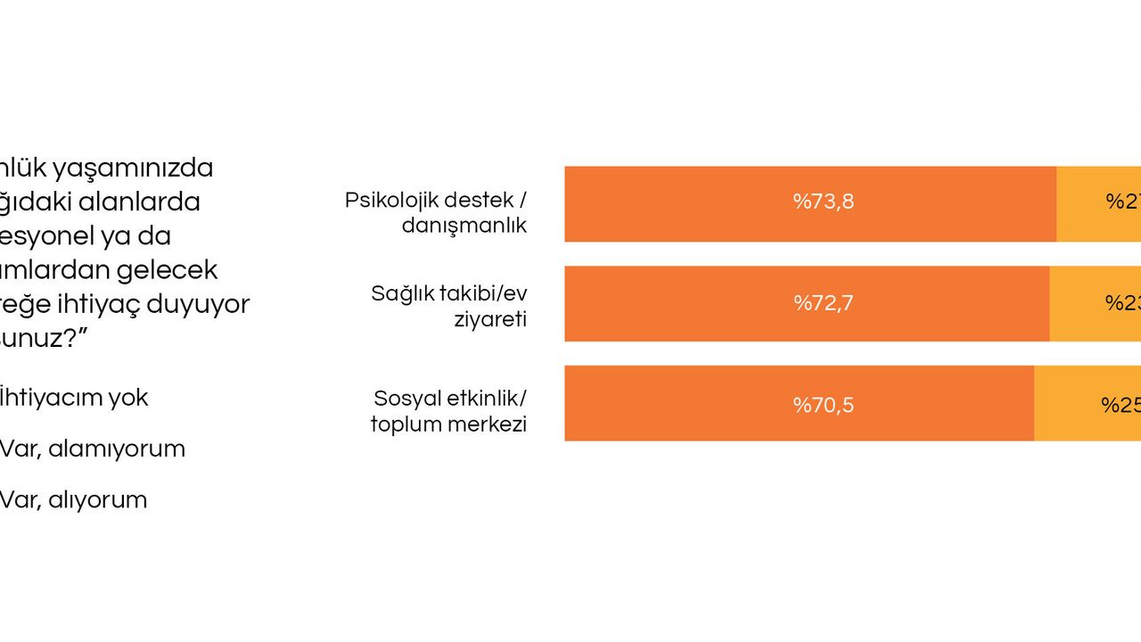Araştırmada yaş almış bireylerin psikolojik sağlığı da incelendi. Psikolojik destek ya da danışmanlık ihtiyacı olduğunu bildiren katılımcıların yüzde 4,9'u bu hizmeti alabilirken, yüzde 21,3'ü alamadığını ifade etti. Cinsiyete göre bakıldığında, psikolojik destek ihtiyacı duyan kadınların oranı yüzde 34,8 iken erkeklerde bu oran yüzde 17,6 olarak ölçüldü. Yaş almış kadınların ruh sağlığı hizmetlerine daha fazla ihtiyaç duyduğu görüldü. Katılımcıların yüzde 32,2'si kendini 'yaşlı' olarak tanımlarken yüzde 52,1'i bu tanımlamayı reddetti.