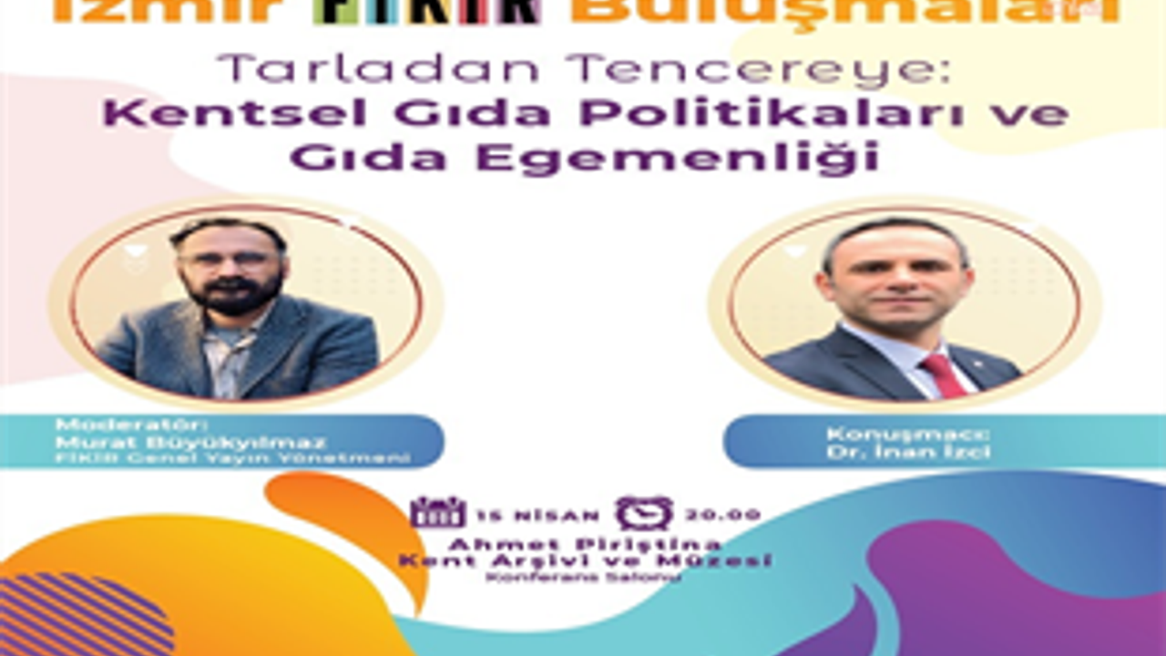 İzmir Büyükşehir Belediyesi'nin 'İzmir FİKİR Buluşmaları' dizisinin yeni oturumu, 15 Nisan Çarşamba günü saat 20.00'de Ahmet Piriştina Kent Arşivi ve Müzesi Konferans Salonu'nda gerçekleştirilecek. Dr. İnan İzci'nin konuşmacı, FİKİR Genel Yayın Yönetmeni Murat Büyükyılmaz'ın moderatör olarak yer alacağı buluşmada, kentsel gıda politikaları ve gıda egemenliği başlığı etrafında İzmir'in güncel ihtiyaçları, imkânları ve tartışma alanları değerlendirilecek. 17 Nisan Uluslararası Çiftçi Mücadeleleri Günü'nün açtığı tarihsel ve siyasal çerçeveden hareket eden oturum, tarımı yalnızca ekonomik bir sektör olarak değil emek, yaşam, gıda hakkı, ekoloji ve demokrasi meselesi olarak birlikte düşünmeyi amaçlıyor. Bu yönüyle buluşma, çiftçi mücadelelerinin dünyadaki ve Türkiye'deki birikimini İzmir'in güncel gerçekliğiyle buluşturmayı hedefliyor.