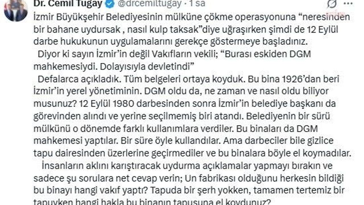 Diyor ki sayın İzmir'in değil, Vakıfların vekili; 'Burası eskiden DGM mahkemesiydi. Dolayısıyla devletindi.' Defalarca açıkladık. Tüm belgeleri ortaya koyduk. Bu bina 1926'dan beri İzmir'in yerel yönetiminin. DGM oldu da ne zaman ve nasıl oldu biliyor musunuz? 12 Eylül 1980 darbesinden sonra İzmir'in belediye başkanı da görevinden alındı ve yerine seçilmemiş biri atandı. Belediyenin bir sürü mülkünü o dönemde farklı kullanımlara verdiler. Bu binaları da DGM mahkemesi yaptılar. Bir süre öyle kullandılar. Ama darbeciler bile gizlice tapu dairesinden üzerlerine geçirmediler ve bu binalara böyle el koymadılar.