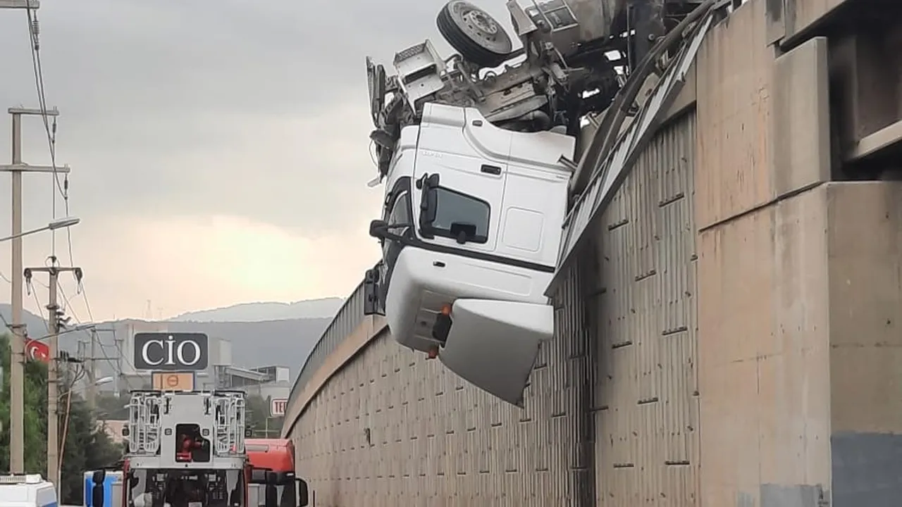 Ankara Caddesi 4. Sanayi Sitesi girişindeki yolda kontrolden çıkan tır, yaklaşık 12 metrelik viyadükte asılı kaldı.