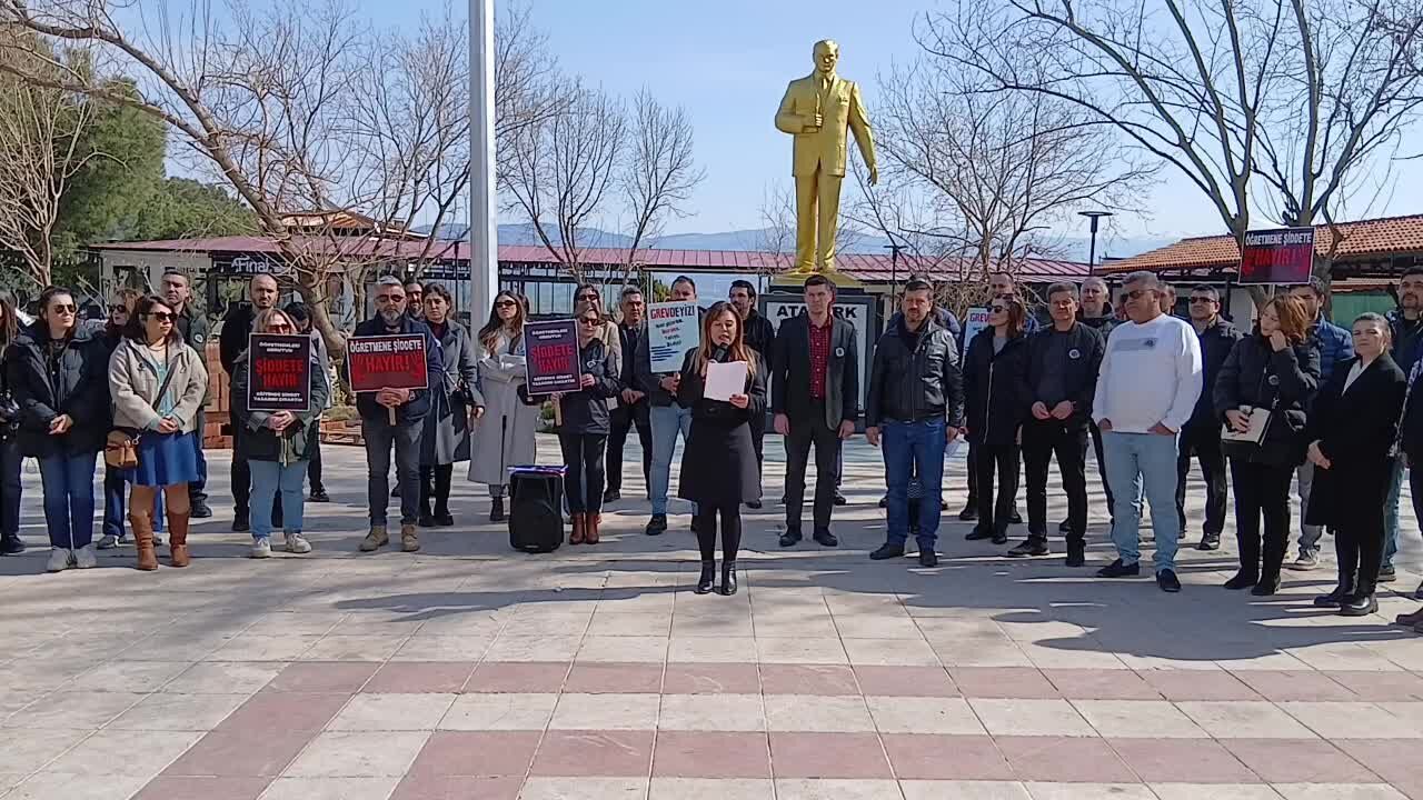 Öğretmen Fatma Nur Çelik'in öldürülmesi Aydın'ın Karacasu ilçesinde protesto edildi. Eğitim İş Karacasu Temsilcisi İbrahim Mihmak ile çok sayıda öğretmenin katıldığı eylemde basın açıklamasını okuyan Karacasu Şehitleri Ortaokulu Müdürü Ayşe Özkan şunları söyledi: