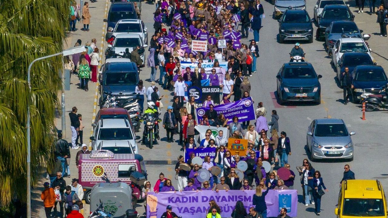 (AYDIN) - Kuşadası Belediyesi Kadınca Oluşumu tarafından 8 Mart dolayısıyla gerçekleştirilen kortejde, ellerinde pankart ve döviz taşıyan kadınlar, kadına yönelik şiddet ve cinayetler ile İstanbul Sözleşmesi'nin önemine dikkati çekti.