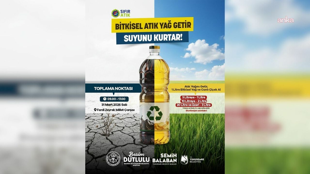 Manisa Büyükşehir Belediyesi ve Yunusemre Belediyesi iş birliğiyle başlatılan 'Atık Yağını Getir, Suyunu Kurtar' kampanyası ile evsel bitkisel atık yağlar çevre kirliliği olmaktan çıkarılarak ekonomiye geri kazandırılacak. 'Sıfır Atık' vizyonu doğrultusunda hazırlanan kampanya çerçevesinde atık yağını getiren vatandaşlar hem doğayı korumuş olacak hem de yeni bitkisel yağ ve canlı çiçek hediyeleriyle ödüllendirilecek.