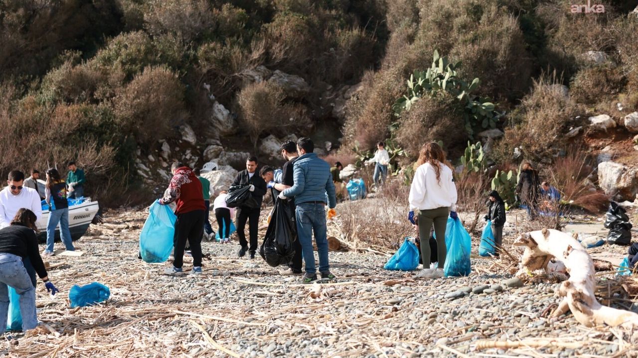 Son dönemde etkili olan fırtınalar nedeniyle denizden karaya sürüklenen atıklar, gönüllü gençler ve belediye ekiplerinin çalışmasıyla toplandı.