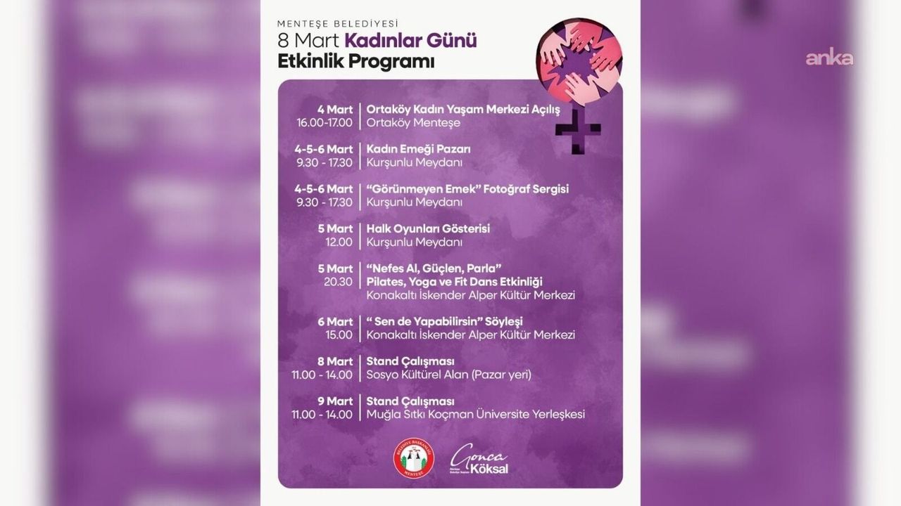 Menteşe'de kadınların sosyal, kültürel ve ekonomik hayattaki yerini güçlendirmeyi hedefleyen 8 Mart programı; 4 Mart'ta Ortaköy'de gerçekleştirilecek açılışla başlayacak.