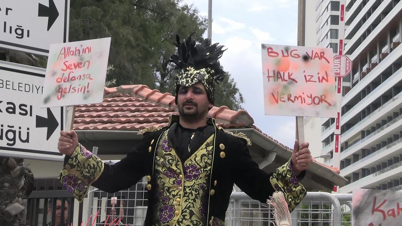 Kostümleriyle alana alan sanatçılar, ellerinde 'Google Maps'e bakın, burası halkın', 'Bug var halk izin vermiyor', 'Hile kodu yok' yazılı dövizler taşırken 'İzmir için, sanat için' yazılı pankart açtı.