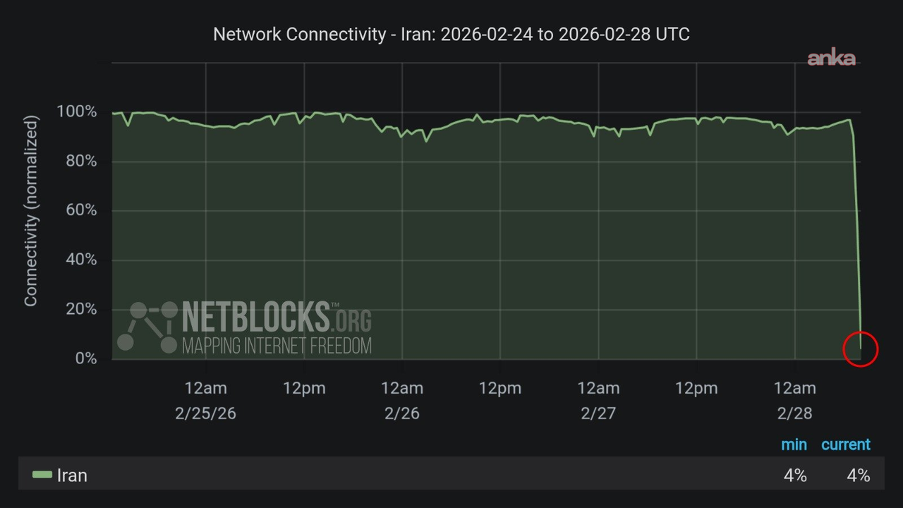 NetBlocks'un paylaştığı ağ verilerine göre, İran'daki bağlantı oranı kısa sürede dramatik biçimde gerileyerek asgari seviyeye indi. Kuruluş, söz konusu kesintinin ABD ve İsrail'in İran'a yönelik askeri operasyonlarının ardından meydana geldiğini belirtti.