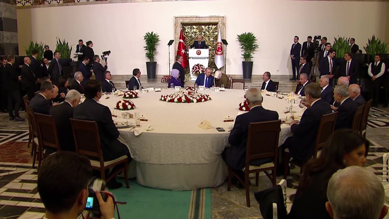 (TBMM) - TBMM Başkanı Numan Kurtulmuş, Cumhurbaşkanı Erdoğan'ın katılımıyla milletvekillerine iftar verdi. İftara CHP ve İYİ Partililer katılmazken DEM Partililer ve bakanlar, eski Meclis başkanları ile siyasiler ve milletvekilleri katıldı. Kurtulmuş, iftar sonrası yaptığı konuşmada, 'Türkiye güçlü olmak zorundadır. Düne göre daha da güçlü olmak zorundadır. Bu güçten kasıt sadece askeri ve savunma sanayi alanındaki güç değil. Aynı zamanda ekonomik güç, siyasi güç ve toplumsal güçtür. İnşallah başlanmış olan bu yol tamamına erdirilecek ve Türkiye'de artık kıyamete kadar silahlar susacak, sadece kardeşlik dili konuşacaktır' dedi.