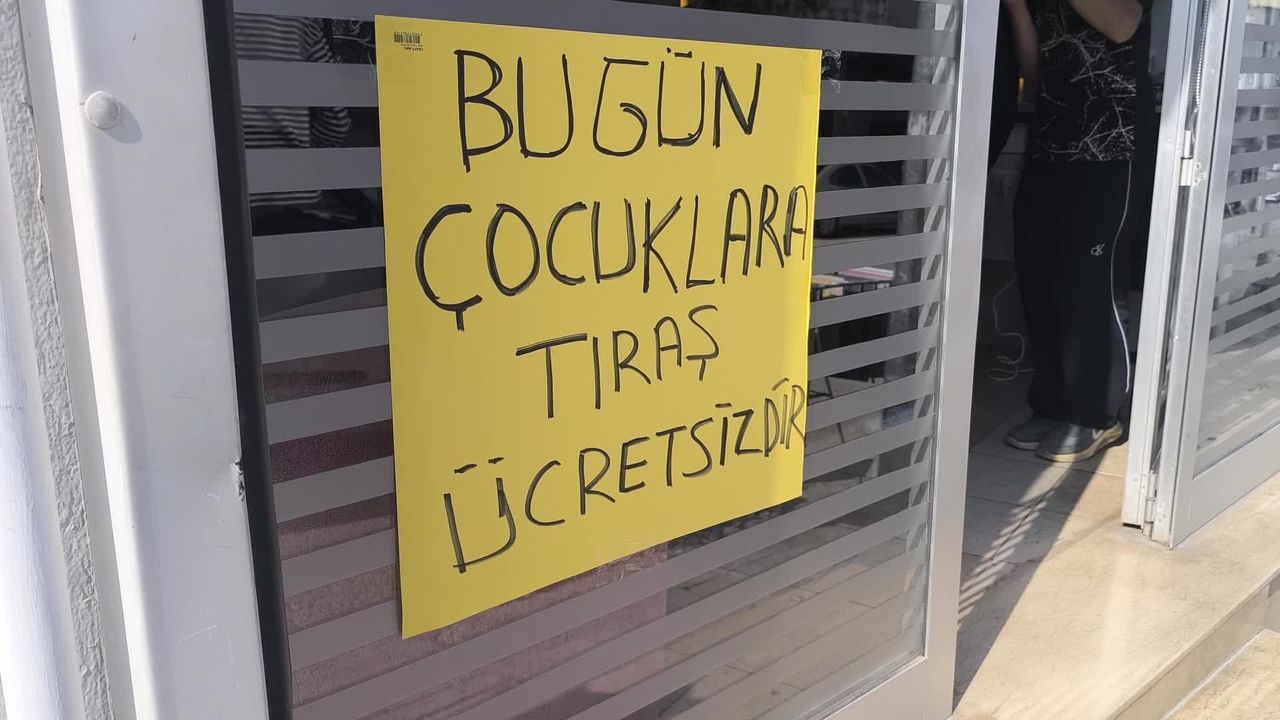 'Bugün 23 Nisan Ulusal Egemenlik ve Çocuk Bayramı olduğu için bütün çocukları ekip arkadaşlarımla beraber ücretsiz tıraş etme kararı aldık. Belki durup olmayanlar vardır, garibanlar vardır, tıraş olamayanlar vardır, hani parası olmayanlar vardır. Biz garibanlardan yanayız. Bugün 24 saat boyunca açığız, tıraş hizmeti vereceğiz. Herkes buyursun gelsin, herkese kapımız açık.