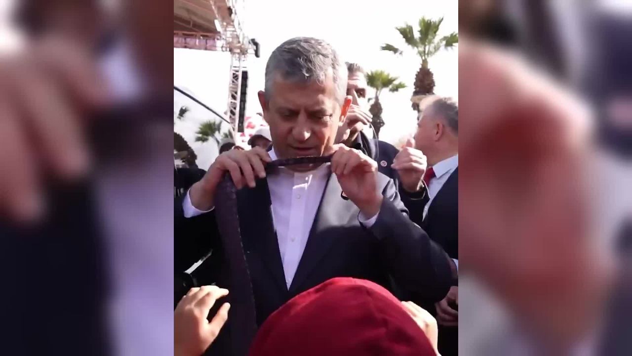 CHP lideri Özel, bugün Urla Belediyesi'nin toplu açılış törenine katıldı. Tören sırasında yanına yaklaşan bir çocuk, Özel'den kravatını istedi.
