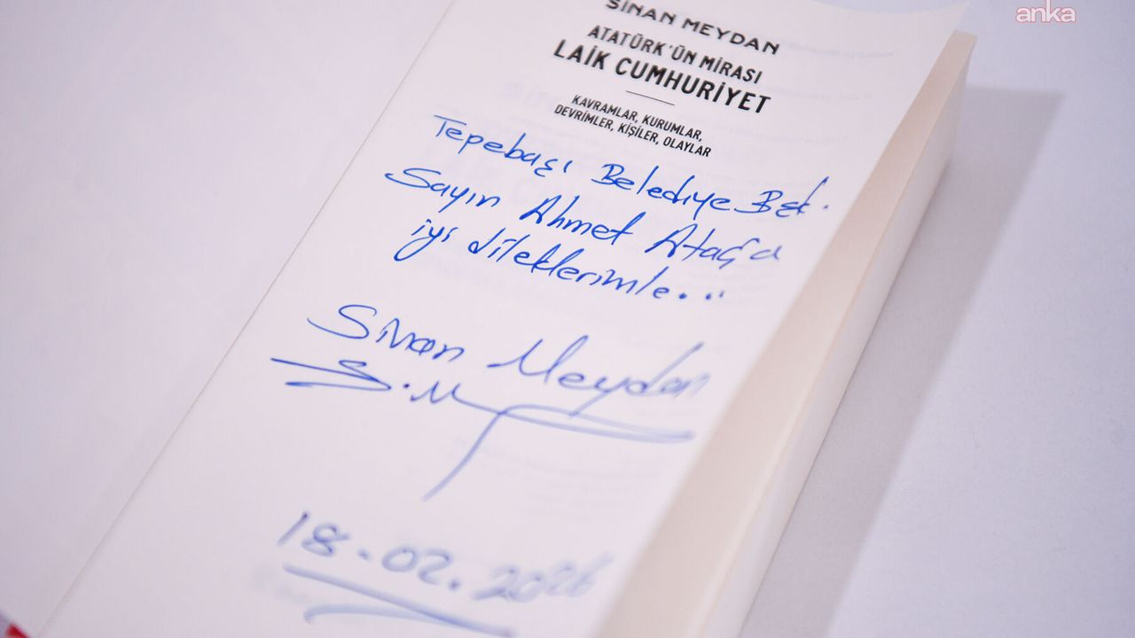 Sinan Meydan, Atatürk'ün Cumhuriyet anlayışı ve laik mirasını ele alan yeni kitabını, 'Tepebaşı Belediye Başkanı Sayın Ahmet Ataç'a iyi dileklerimle' notuyla Ataç'a gönderdi.