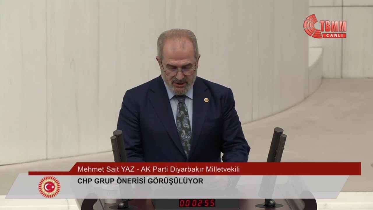 AK Parti Diyarbakır Milletvekili Mehmet Sait Yaz, CHP'nin Türkiye'de faaliyet gösteren cemaat ve tarikat yapılarının kamusal alandaki faaliyetlerinin tüm yönleriyle araştırılması amacıyla verdiği öneri üzerine söz aldı.