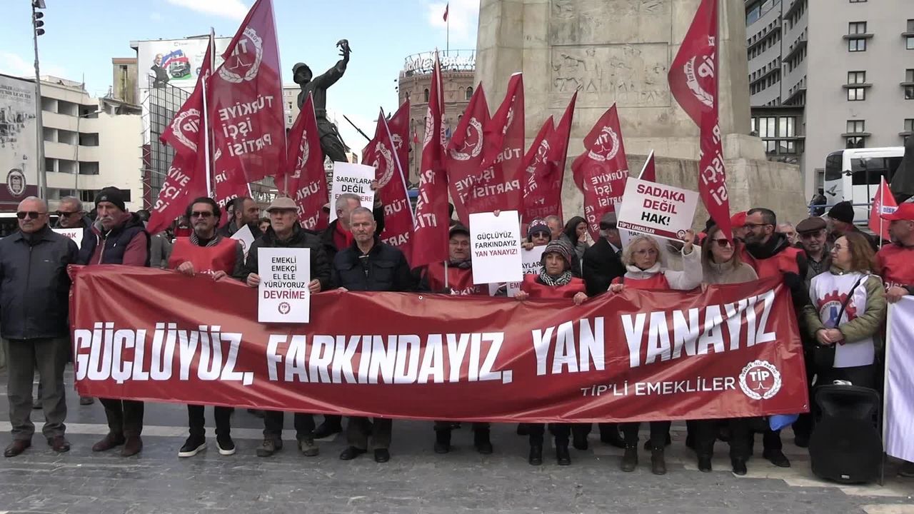 Emekliler eylemde, 'Saraylara değil, emeklilere', 'Emeklinin gücünü hafife alma', 'Emeklilikte insanca yaşam haktır', 'Güçlüyüz, farkındayız, yan yanayız', 'Sadaka değil hak' ve 'İnsanca yaşam hakkımız' yazılı pankartlar taşırken, 'Emeklinin onuru iktidarı yenecek' ve 'Saraya değil, emekliye bütçe' gibi sloganlar attı.